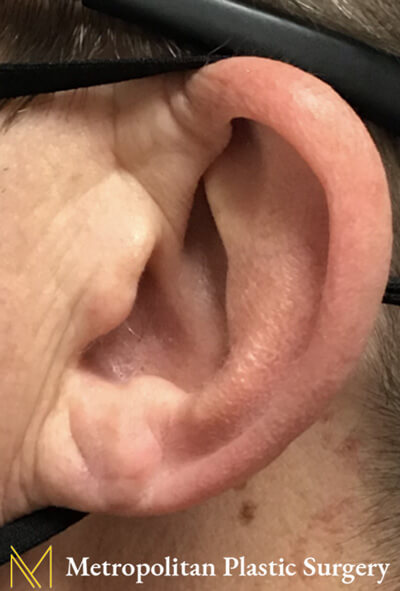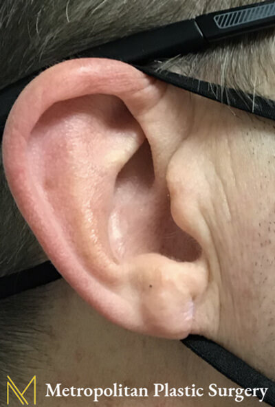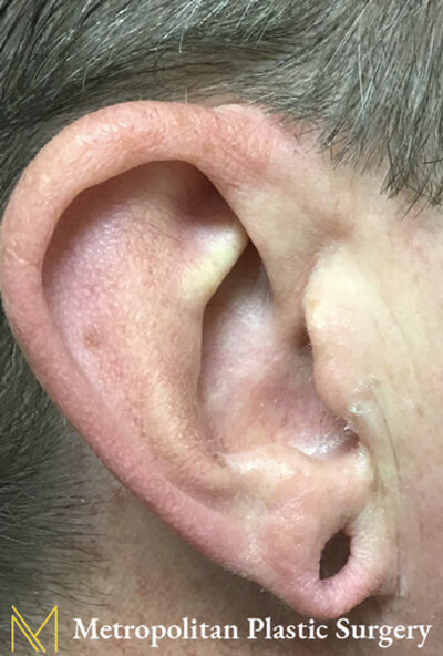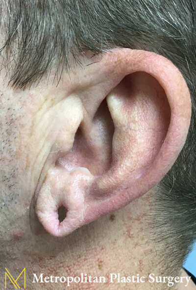 50-year-old male who hade gages in both ears underwent in office earlobe repairs; The photos on the right are 2 months post-op
